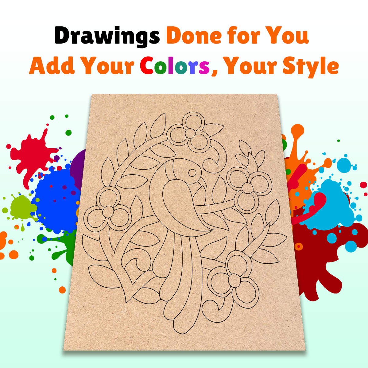 Unleash creativity with our Pre-marked MDF Painting Board featuring a beautiful peacock design surrounded by flowers. This ready-to-paint board comes with pre-drawn outlines, making it perfect for children to add their own colors and style.