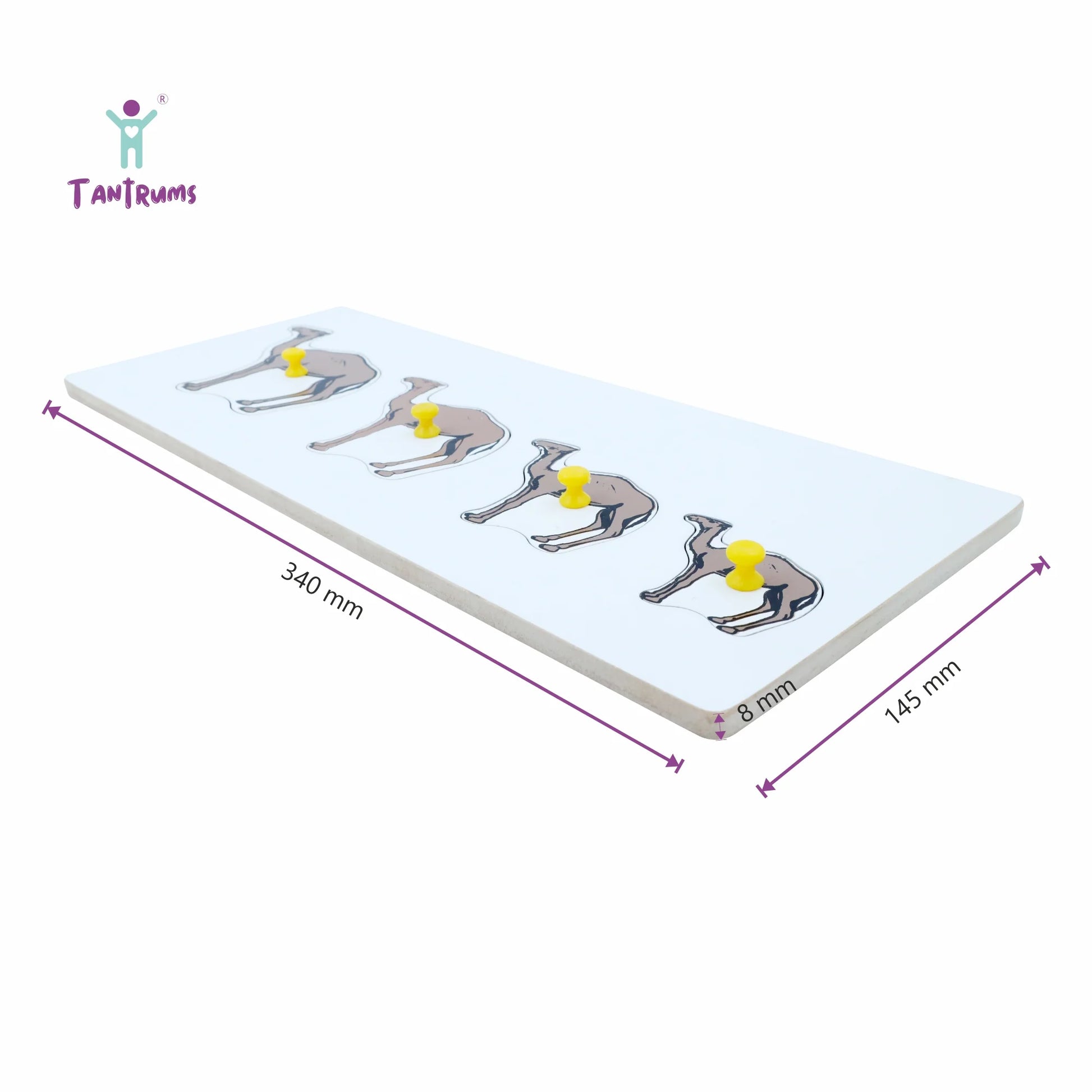 Introduce your child to size sequencing with this charming wooden camel puzzle featuring four beautifully illustrated camels in graduated sizes. Perfect for developing early math concepts and cognitive skills through hands-on play.